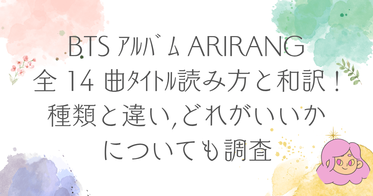 BTSの新アルバムARIRANGについて、全14曲のタイトルの読み方や和訳、さらに種類ごとの違いまで知りたい方に向けてまとめました。形態が多くて迷いやすいアルバムですが、ポイントを押さえれば自分に合う1枚が選びやすくなります。この記事では、曲名一覧、形態の違い、買い方の考え方まで、やさしくわかりやすく解説します。