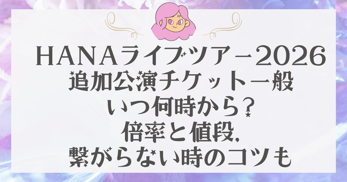 HANAの「1st TOUR 2026 “Born to Bloom”」追加公演について、一般発売はいつからなのか、何時に始まるのか、チケットの値段や倍率の目安、そしてつながらない時の対策まで、公式情報をもとに調べました。 追加公演は大阪城ホールと日本武道館で行われるため、人気が高くなることも考えられます。