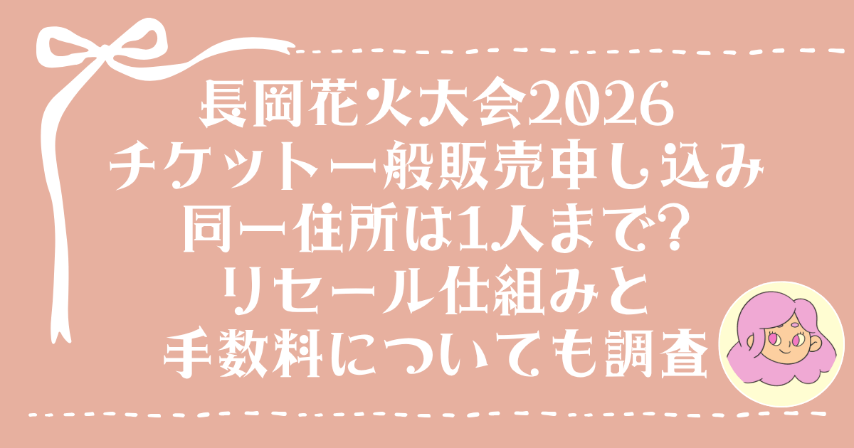長岡花火大会2026のチケットは、毎年かなりの争奪戦になります。とくに気になるのが、一般販売の申込みは同一住所で何件までできるのか、家族で申し込めるのか、そして落選や都合が合わなかった場合の公式リセールはどうなっているのか、という点ではないでしょうか。そこで今回は、長岡花火の公式サイトやFAQ、販売スケジュールをもとに、一般販売のルール、同一住所の制限、リセールの仕組み、そして手数料の考え方まで調べました 。